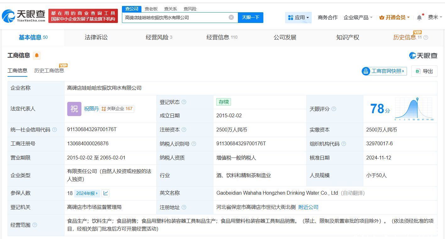 天眼查经营风险信息显示,近日,高碑店娃哈哈宏振饮用水有限公司新增一则简易注销公告,公告期为9月28日至10月18日。